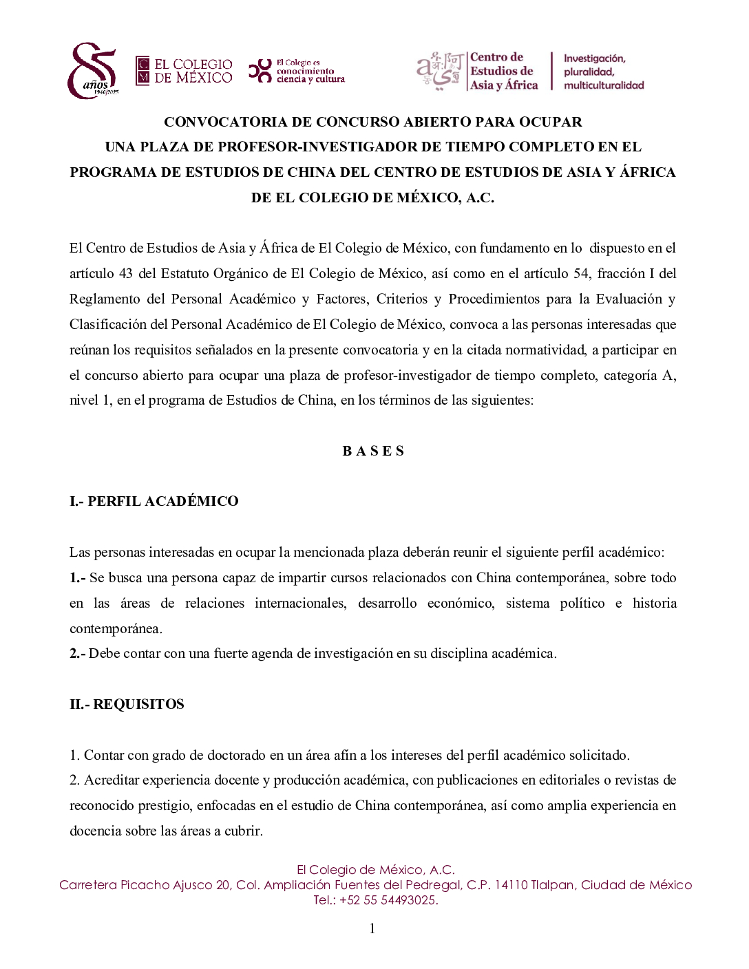 CONVOCATORIA DE CONCURSO ABIERTO PARA OCUPAR UNA PLAZA DE PROFESOR-INVESTIGADOR DE TIEMPO COMPLETO EN EL PROGRAMA DE ESTUDIOS DE CHINA DEL CENTRO DE ESTUDIOS DE ASIA Y ÁFRICA DE EL COLEGIO DE MÉXICO, A.C.
