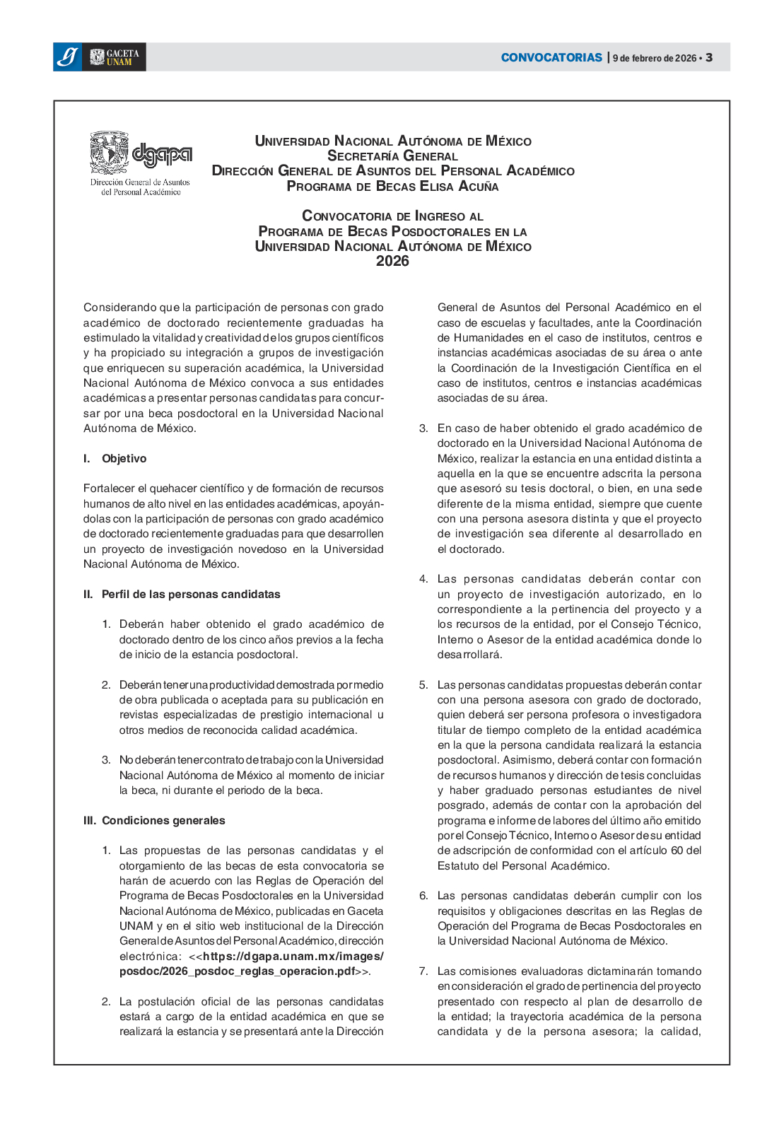 Convocatoria de Ingreso al Programa de Becas Posdoctorales en la Universidad Nacional Autónoma de México 2026