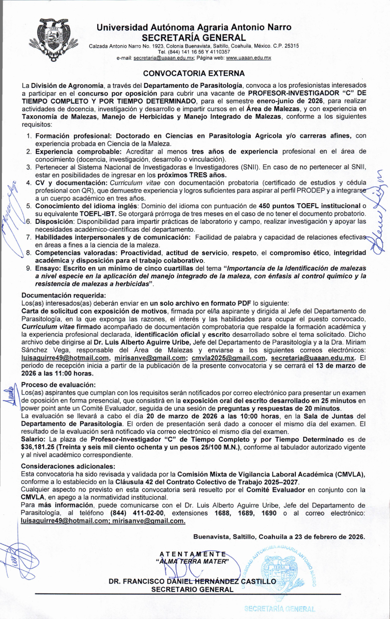 Audiencia Doctorado en Ciencias en Parasitología Agrícola y/o carreras afines con experiencia probada en Ciencias de la Maleza