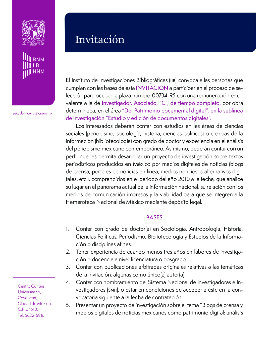 Investigador, Asociado, C, de tiempo completo, por obra determinada, en el área Del Patrimonio documental digital, en la sublínea de investigación Estudio y edición de documentos digitales