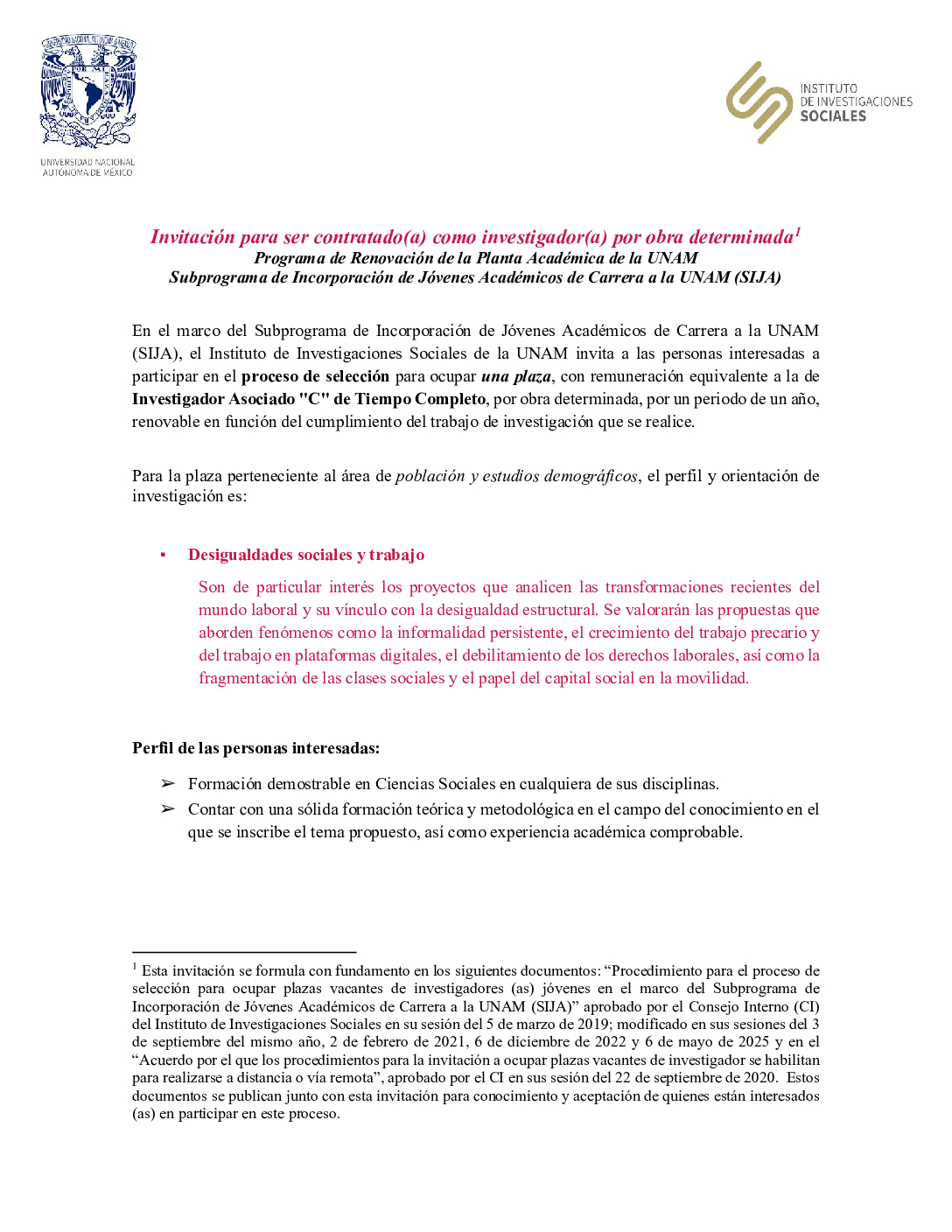 proceso de selección para ocupar una plaza, con remuneración equivalente a la de Investigador Asociado «C» de Tiempo Completo, por obra determinada, por un periodo de un año, renovable en función del cumplimiento del trabajo de investigación que se realice. Para la plaza perteneciente al área de población y estudios demográficos, el perfil y orientación de investigación es: Desigualdades sociales y trabajo