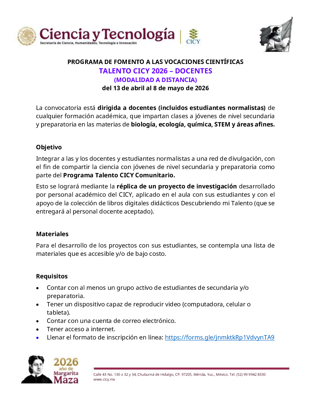 PROGRAMA DE FOMENTO A LAS VOCACIONES CIENTÍFICAS TALENTO CICY 2026 – DOCENTES (MODALIDAD A DISTANCIA)